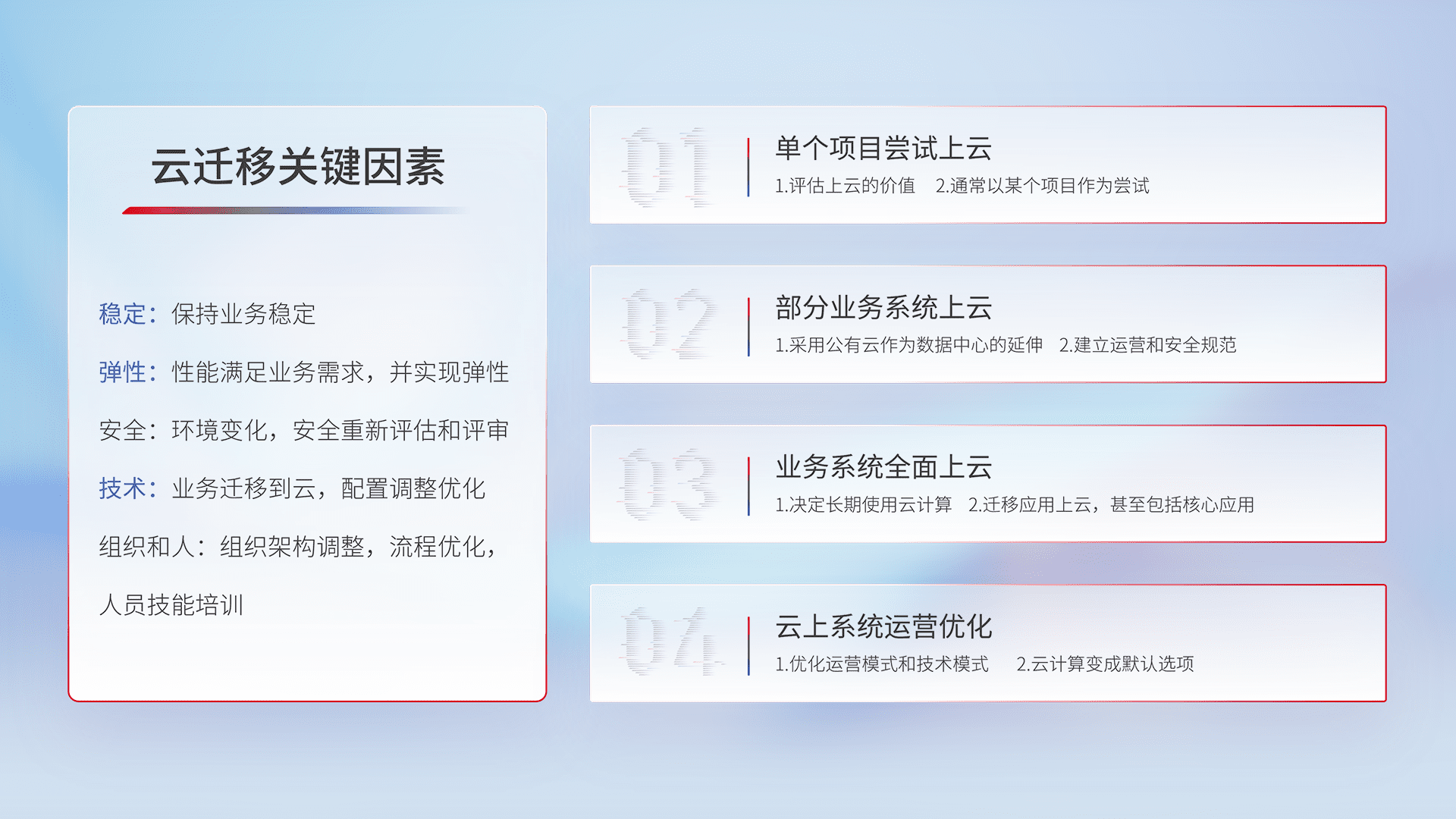 结合实际业务,,,,从规划设计、、、云平台选型、、、、云原生改造、、数据迁移、、集成交付,,,迁移全过程为客户识别最佳上云路径,,做好风险识别管理,,设计网络架构、、、、身份权限、、、安全审计合规、、、、操作审计、、、、日志审计、、、、监控告警策略、、多站点容灾设计等,,,对云上基础设施进行整体规划,,,,提升IT治理水平,,以满足弹性、、高可用、、、高性能的需求。。。。