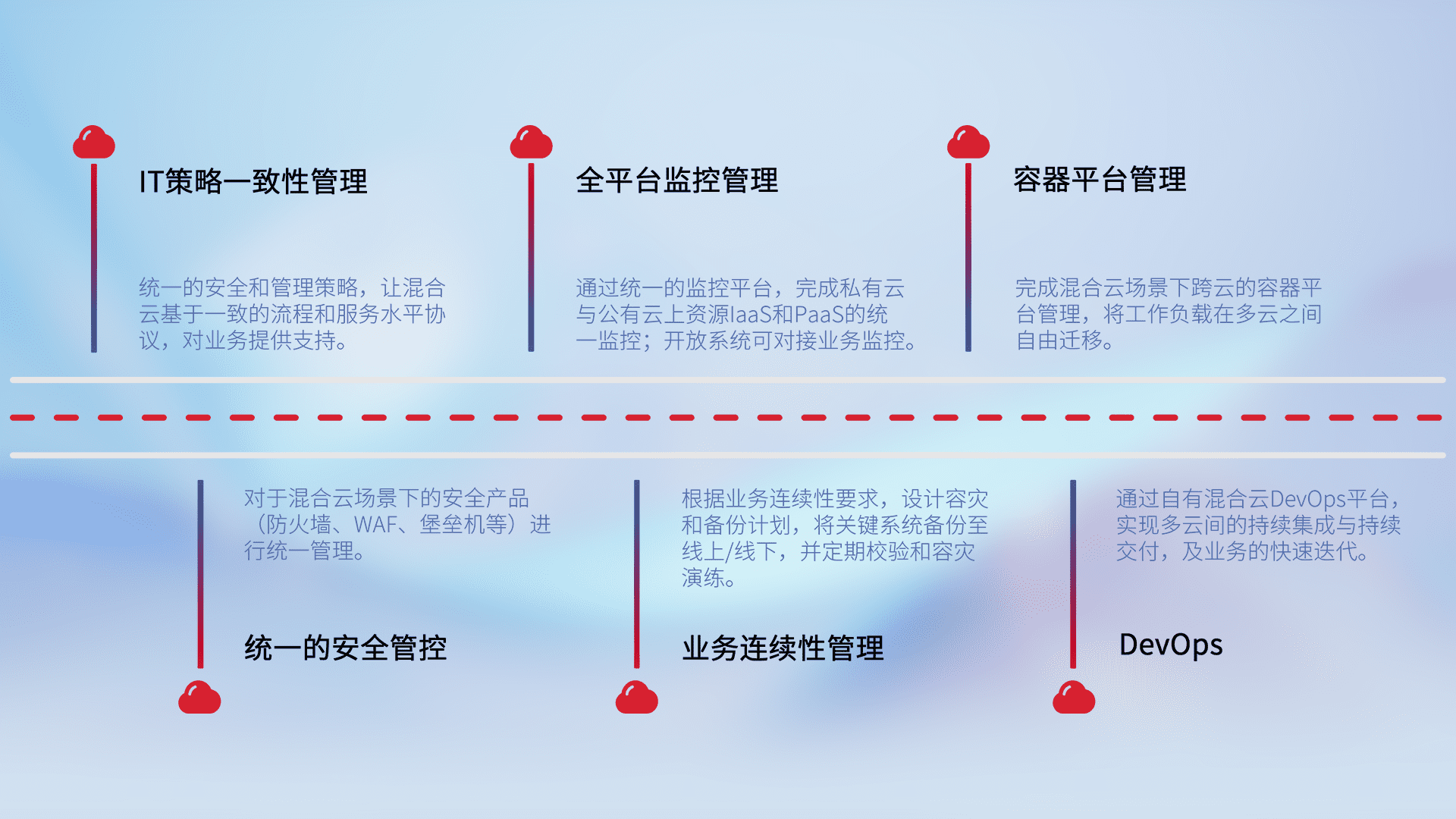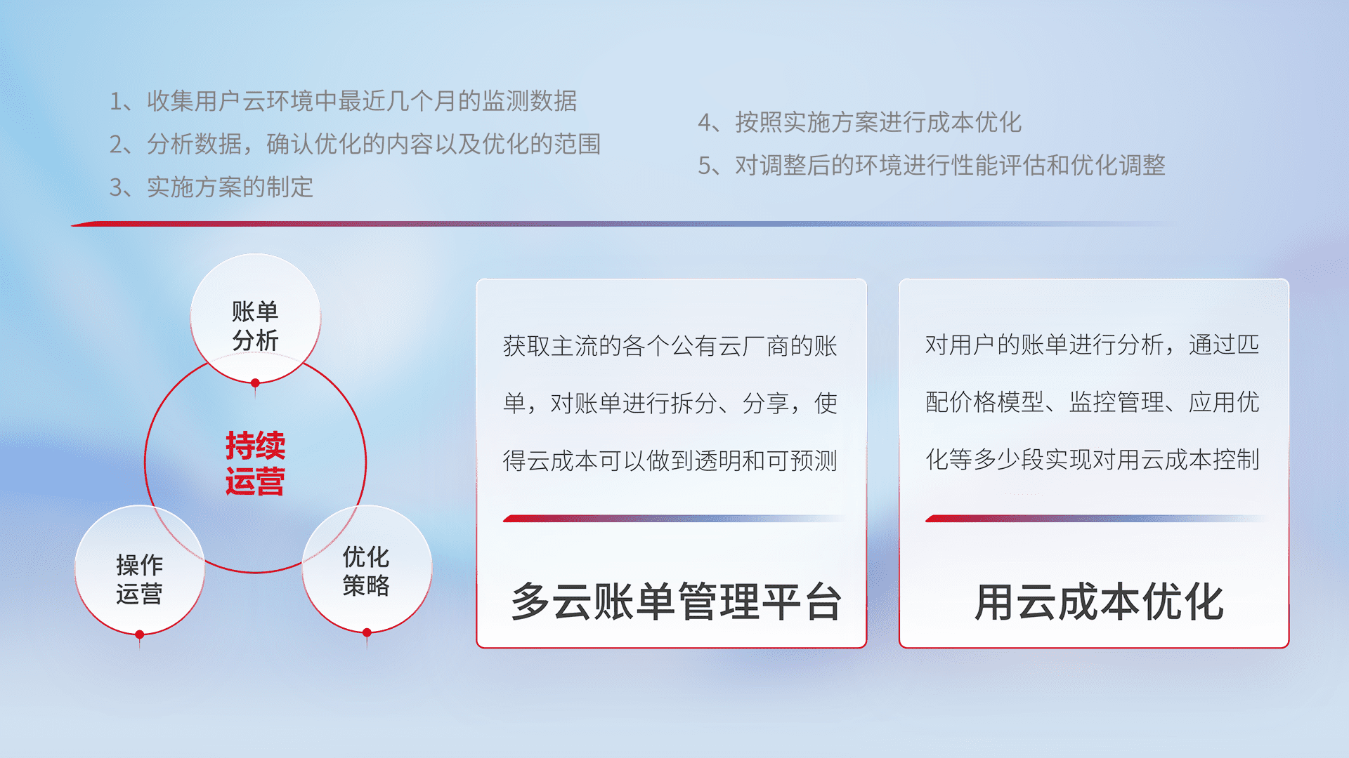 通过多云纳管,,以统一的资源数据模型把客户的云资源进行抽象和封装,,,,进而实现对多云资源的统一操作,,保障云资源管理的可靠性、、、、稳定性与可用性。。。量身定制化运维内容,,,配置、、、、开发运维、、、、补丁管理、、备份、、监控、、认证和访问管理、、审计和日常巡检等,,保障在用云过程中的可靠度,,稳定度以及高可用率。。。