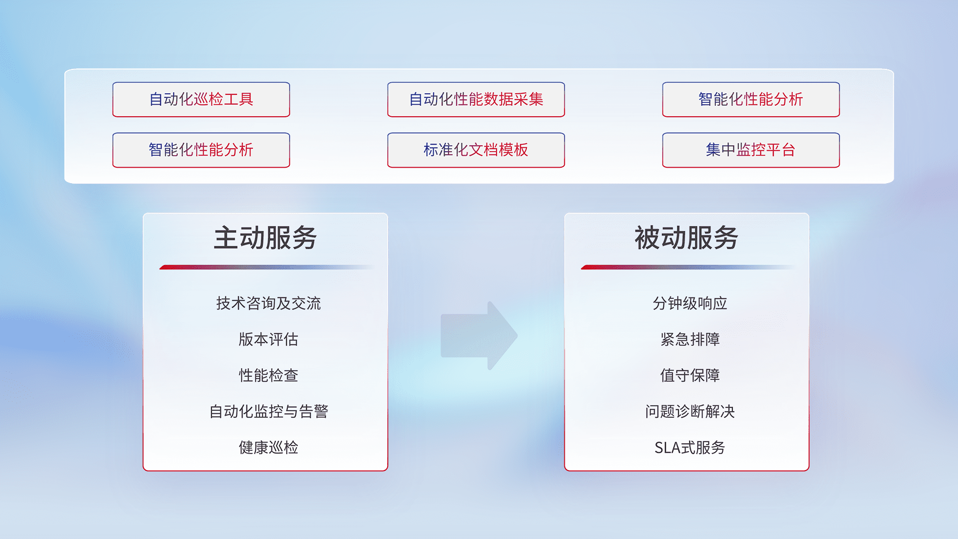 智能化工具和标准化文档,,,保障服务质量,,,提供主动服务(包含技术咨询、、、、版本评估、、性能检查、、、自动化监控与告警、、健康巡检)和被动服务包含(分钟级响应、、、、紧急排障、、值守保障、、、、问题诊断解决、、、、SLA服务)。。。