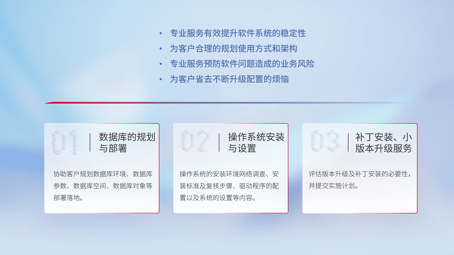 为客户提供软件规模升级、、快速部署、、、、按需配置的专业服务,,,从数据库的规划与部署到操作系统的安装与设置,,再到补丁安装和小版本升级提供支持。。。。